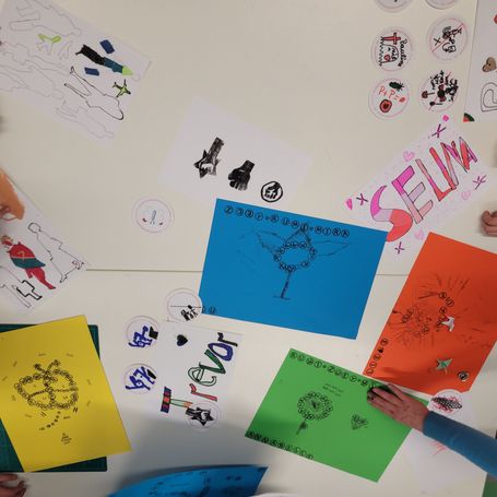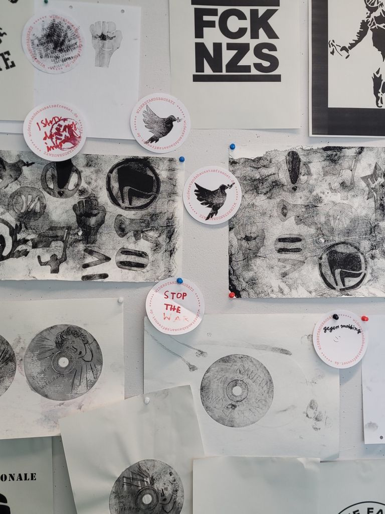Constanze Eckert und ich hatten den Widerstandsbausatz dabei: Aufkleber, Drucke und Materialien, die Protest sichtbar machen. Die Kinder druckten an unserer Druckerpresse und klebten – und am Ende gab es prägnante Ergebnisse: „Stop the War", „gegen Mobbing", Friedenstauben, erhobene Fäuste, eigene Zeichen.